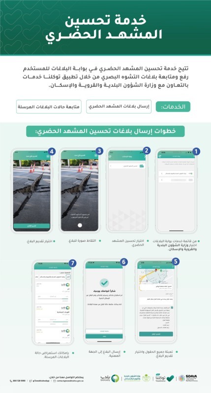 وبين التطبيق أنه بإمكان الراغبين في الإبلاغ عن حالات التشوه البصري الدخول من بوابة البلاغات واختبار وزارة الشؤون البلدية والقروية والإسكان ثم اختيار تحسين المشهد الحضري وبعدها التقاط صورة للبلاغ واختيار تقديم البلاغ وبعدها تعبئة جميع الحقول واختيار تقديم البلاغ ومن ثم إرسال البلاغ إلى الجهة المعنية مع إمكانية استعراض حالات البلاغات المرسلة.