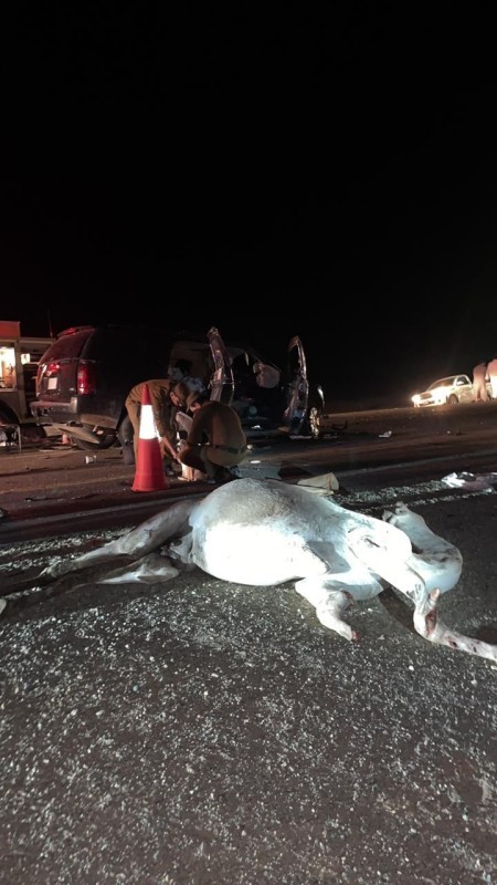 لقي رجل وامرأة مصرعهما وأصيبت ٣ فتيات نتيجة اصطدام مركبة نوع «جمس» بجمل سائب ثم انحرافها عن مسارها لتصطدم بشاحنة في الاتجاه الآخر على طريق بيشة - الجعبة.