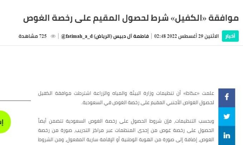 في حين أثار خبر «عكاظ» المنشور في عدد أمس (الاثنين) بتاريخ 29 أغسطس 2022 الموافق 2 صفر 1444 بعنوان (موافقة «الكفيل» شرط لحصول المقيم على رخصة الغوص) جدلا بين الصحيفة والاتحاد السعودي للرياضات البحرية والغوص، أكد الاتحاد عدم صحة المعلومة، إذ لم يصدر عنه أو من أي جهة أخرى مثل هذا الاشتراط.