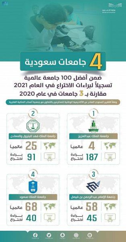 سجّل تعليم المملكة تقدماً علمياً جديداً ضمن سلسلة إنجازاته المتواصلة على المستوى العالمي، حيث صنفت 4 جامعات سعودية ضمن أفضل 100 جامعة عالمية تسجيلًا لبراءات الاختراع في العام 2021، مقارنة بـ3 جامعات في العام 2020، وذلك وفقاً للتقرير السنوي الصادر عن الأكاديمية الوطنية للمخترعين بالتعاون مع جمعية أصحاب الملكية الفكرية.