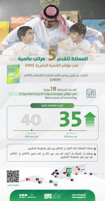 تقدّمت المملكة 5 مراتب في نتائج مؤشر التنمية البشرية الصادر عن تقرير برنامج الأمم المتحدة الإنمائي 2022م، حيث أصبح ترتيبها 35 عالمياً من بين 191 دولة مقارنةً بالمرتبة 40 في الإصدار السابق من التقرير، كما حصلت المملكة على المرتبة العاشرة من بين دول مجموعة العشرين، وحققت أعلى تقدم بين نتائج العامين 2019م و2021م من بين دول مجموعة العشرين.