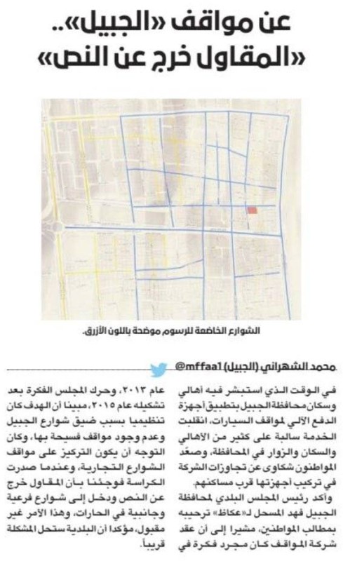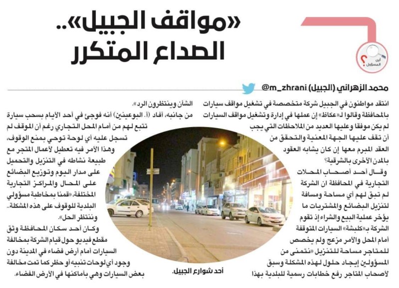 وكانت «عكاظ» قد أشارت لمعاناة الأهالي في المنطقة الشرقية وزائريها جرّاء خدمة (موقف) في تقريرين سابقين، تحت عنوانين: عن مواقف «الجبيل».. «المقاول خرج عن النص»، و«مواقف الجبيل».. الصداع المتكرر.