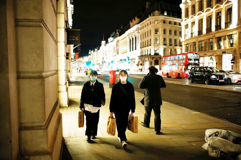 امرأتان ترتديان الكمامة في شارع ريجنت بلندن خوفاً من الإصابات المتزايدة. (وكالات)