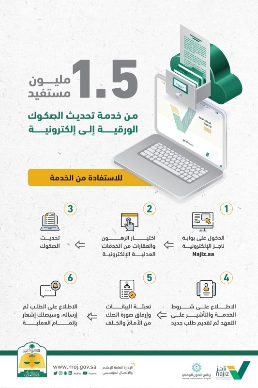 كشفت وزارة العدل أن عدد المستفيدين من خدمة تحديث الصكوك الورقية إلى إلكترونية، تجاوز 1.5 مليون مستفيد، في ظل تطوير الخدمة وتحسين جودتها من خلال تسهيل و تبسيط الإجراءات.