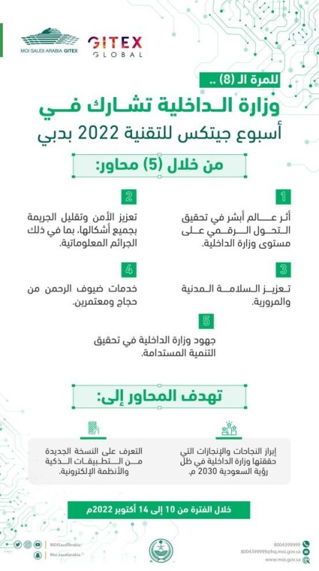 تحت عنوان «عالم أبشر لوطن آمن» تشارك وزارة الداخلية في معرض جيتكس للتقنية 2022 المقام في دبي خلال الفترة من 10 إلى 14 أكتوبر 2022، وذلك للمرة الثامنة عبر منصة موحدة تجمع تحت مظلتها الجهات الأمنية والخدمية في الوزارة.