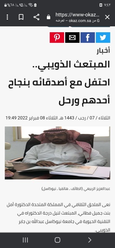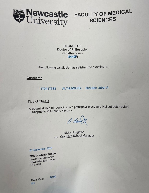 منحت جامعة نيوكاسل في المملكة المتحدة، الدكتوراه في التقنية الحيوية للمرحوم عبدالله بن جابر الذويبي الثبيتي، المبتعث من كلية الطب جامعة الباحة ، الذي توفي في رجب من العام الماضي، بعد أن احتفل مع عدد من زملائه بنجاح أحدهم، ليصعد إلى غرفته ويُفاجأ الجميع بوفاته.