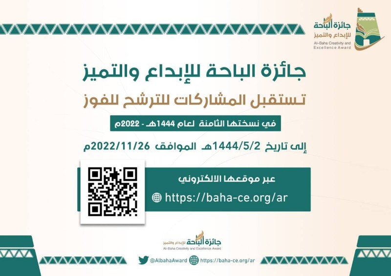 بتوجيه أمير منطقة الباحة الأمير الدكتور حسام بن سعود بن عبدالعزيز، أعلنت جائزة الباحة للإبداع فتح باب التسجيل في دورتها الثامنة، للراغبين في المنافسة على جوائزها؛ عبر موقع الجائزة الإلكتروني.