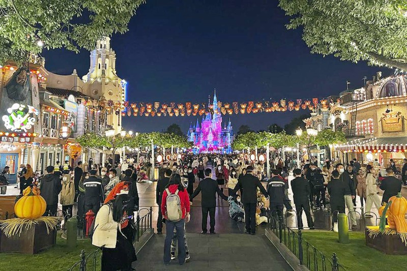 حراس حديقة ديزني لاند في شنغهاي يتماسكون بالأيدي لمنع الزوار من مغادرتها قبل إكمال الفحوص المطلوبة. (وكالات)