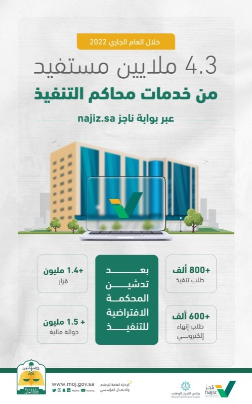 أعلنت وزارة العدل أن محاكم التنفيذ في المملكة أنجزت أكثر من 4.3 مليون خدمة للمستفيدين من محاكم التنفيذ، وذلك بشكل إلكتروني عبر بوابة الخدمات العدلية الإلكترونية ناجز Najiz.sa دون الحاجة لزيارة المحاكم ودوائر التنفيذ، خلال العام الحالي 2022م.