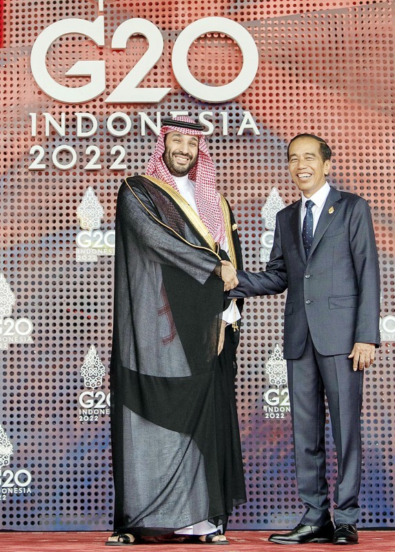 الأمير محمد بن سلمان، مصافحاً الرئيس الإندونيسي جوكو ويدودو، خلال فعاليات قمة العشرين.