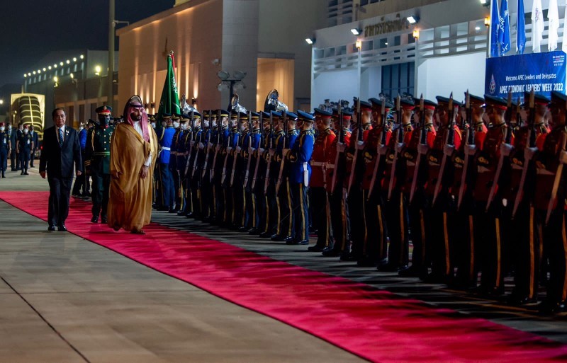 وقد وصل في معية ولي العهد، كل من وزير الطاقة الأمير عبدالعزيز بن سلمان بن عبدالعزيز، ووزير الدولة عضو مجلس الوزراء الأمير تركي بن محمد بن فهد بن عبدالعزيز، ووزير الداخلية الأمير عبدالعزيز بن سعود بن نايف بن عبدالعزيز، ووزير الخارجية الأمير فيصل بن فرحان بن عبدالله، ووزير التجارة وزير الإعلام المكلف الدكتور ماجد بن عبدالله القصبي، ووزير الاستثمار المهندس خالد بن عبدالعزيز الفالح، ووزير الموارد البشرية والتنمية الاجتماعية المهندس أحمد بن سليمان الراجحي، و سكرتير ولي العهد الدكتور بندر بن عبيد الرشيد، ونائب رئيس المراسم الملكية الأستاذ راكان بن محمد الطبيشي.