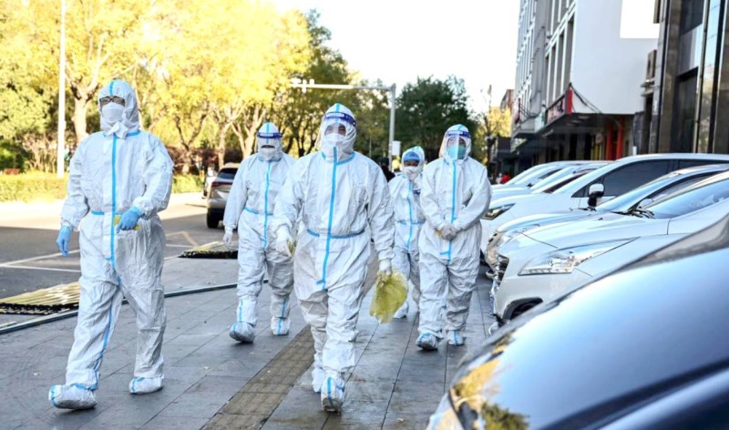 كوادر صحية صينية عند منطقة خاضعة للإغلاق في بكين. (وكالات)