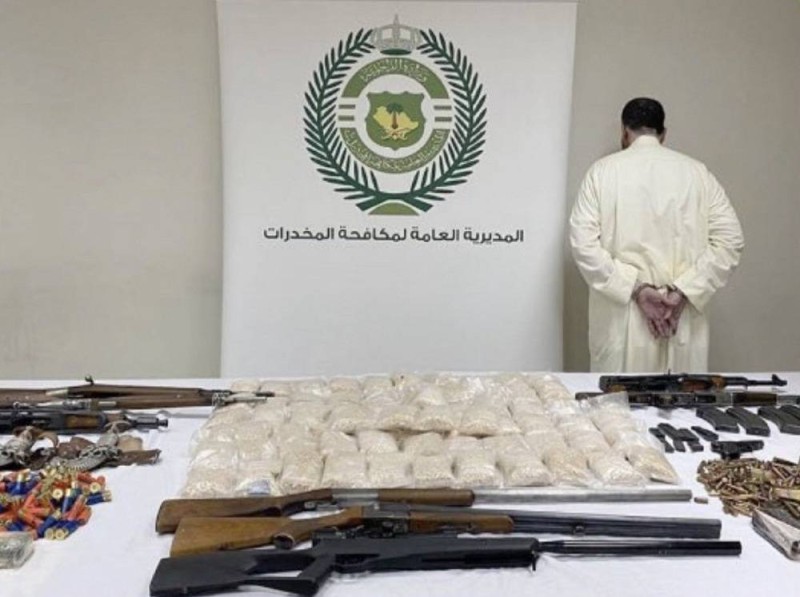 قبضت المديرية العامة لمكافحة المخدرات في منطقة الرياض، على مواطن بحوزته 138 ألف قرص من مادة الإمفيتامين المخدر و9 أسلحة و625 طلقة حية وسلاحان أبيضان، وجرى إيقافه واتخاذ الإجراءات النظامية بحقه، وإحالته إلى النيابة العامة.