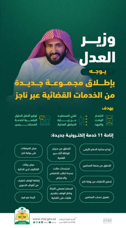 وجه وزير العدل الدكتور وليد بن محمد الصمعاني بإطلاق 11 خدمة إلكترونية قضائية جديدة من خلال بوابة ناجز najiz.sa.