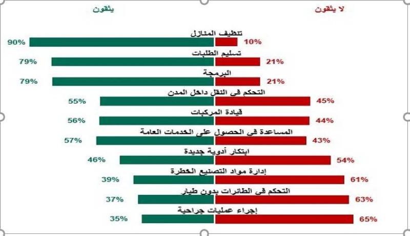 ويرى الموظفون أن الروبوتات مناسبة لأداء مهمات دون أخرى، إذ يثق 90% منهم بالروبوتات في أعمال التنظيف و79% منهم في تسليم الطرود والطلبات. وفي المقابل، يثق أقلّ من نصف المستطلعة آراؤهم في الدراسة بالروبوتات في أداء مهمات مثل إدارة الصناعات الخطرة (39%)، فيما لم يُبدِ سوى 35% ثقتهم بالروبوتات في إجراء العمليات الجراحية. ويمكن تفسير هذه المخاوف بحقيقة أن أكثر من نصف المشاركين في الدراسة من الموظفين (60%) أشاروا إلى عدم وضوح الجهة المسؤولة عن فشل الروبوتات في أداء واجباتها إذا تعرّضت لعطلٍ في المعدّات أو لهجوم رقمي. ويرى 57% بأنه إذا تعطّلت الروبوتات فقد تسبب تهديداً جسدياً للبشر.