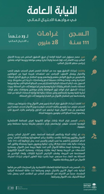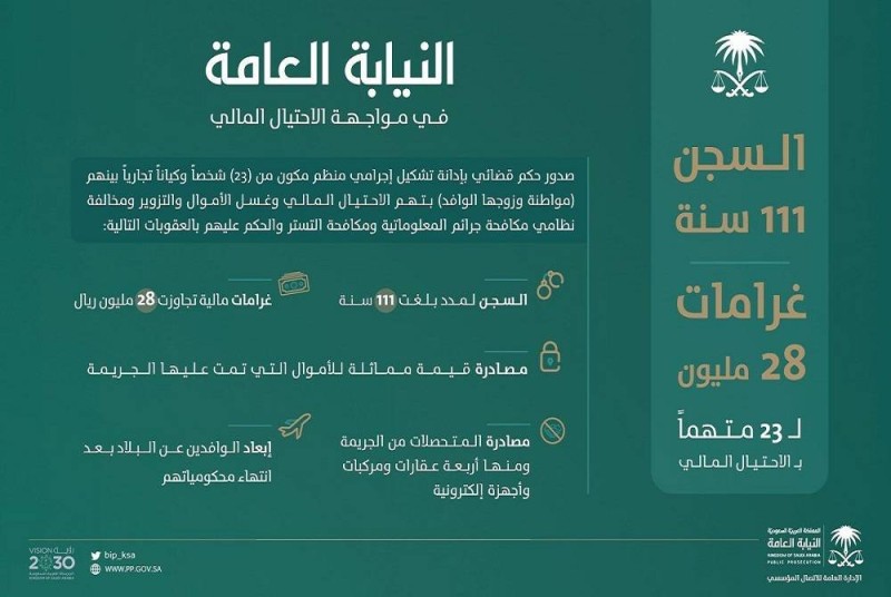 وقد تم إيقاف الجناة وإحالتهم للمحكمة المختصة، بتهم «الاحتيال المالي وغسل الأموال والتزوير ومخالفة نظامي مكافحة جرائم المعلوماتية ومكافحة التستر» وصدر الحكم المتضمن إدانتهم بما نسب إليهم والسجن لمدد يصل إجماليها إلى 111 عاماً، وغرامات مالية بلغت 28,630,000 ريال، ومصادرة قيمة مماثلة للأموال التي تمت عليها جريمة غسل الأموال، ومصادرة المتحصلات من الجريمة ومنها أربعة عقارات ومركبات، ومصادرة الأجهزة الإلكترونية المستخدمة في الجريمة، وشطب التراخيص التجارية للكيانات، وإبعاد الوافدين عن المملكة بعد انتهاء مدة سجنهم، فيما باشرت نيابة التعاون الدولي إجراءات استرداد الأموال من الدول وملاحقة متلقيها.