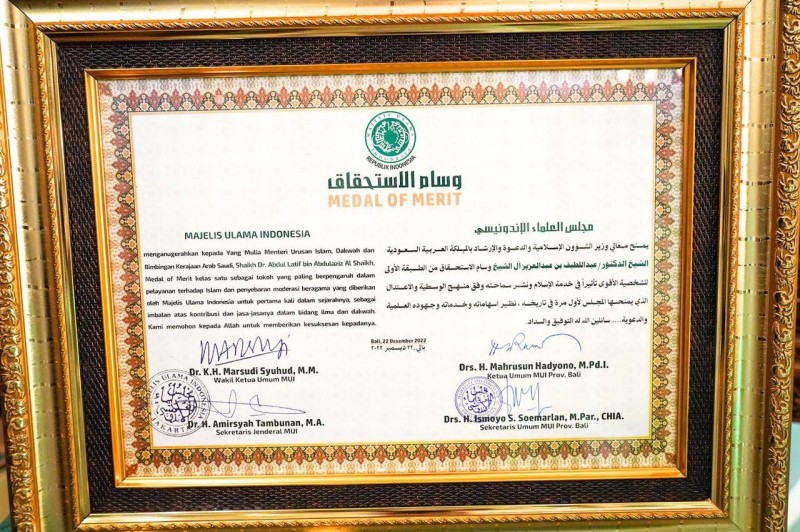 وأعرب رئيس مجلس العلماء في مدينة بالي عن اعتزازه بتقديم وسام مجلس العلماء بالجمهورية نيابة عن رئيس المجلس بجمهورية إندونيسيا الذي يخدم عموم المسلمين في إندونيسيا تقديراً وعرفاناً بالدور المميز الذي يقوم به معالي الوزير «آل الشيخ» وفق رسالة المملكة السامية في خدمة الإسلام ونشر منهج الوسطية والاعتدال، سائلاً الله لمعاليه مزيداً من التوفيق والسداد.