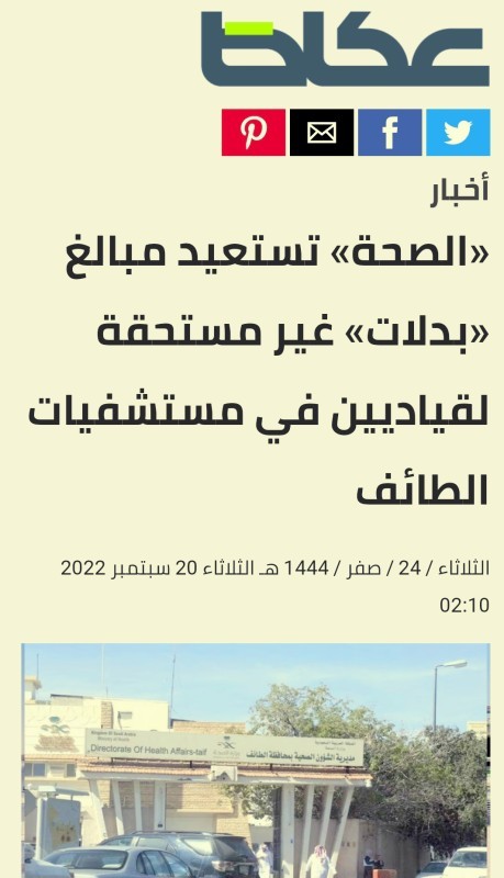 وكانت وزارة الصحة، قد خاطبت «صحة الطائف» بوجود 382 موظفاً صرفت لهم بدلات دون وجه حق، مطالبة بتوضيح أسباب الصرف وتزويدها بمن حصلوا عليها بموجب حكم قضائي؛ ما تسبب في إيقاف البدلات عن الجميع.