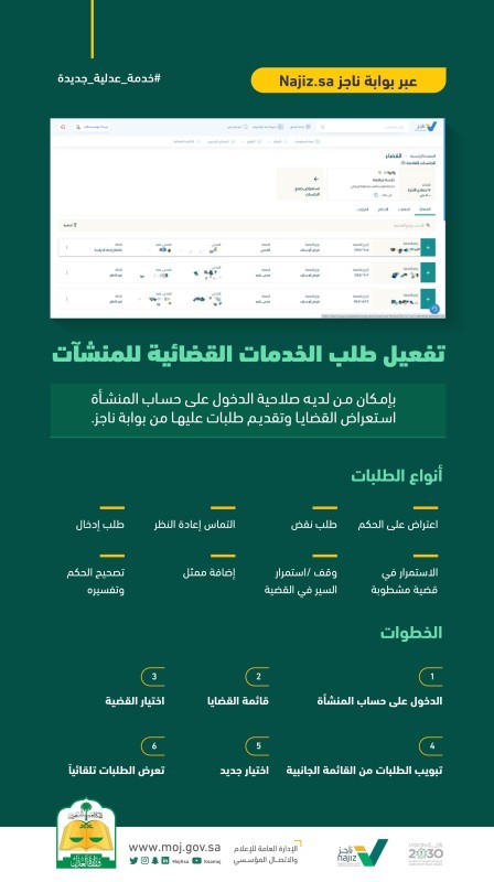أطلقت وزارة العدل حزمة من الخدمات القضائية للمنشآت عبر بوابة ناجز Najiz.sa، بهدف تمكين الممثل النظامي للمؤسسات والشركات والكيانات الاقتصادية من استعراض القضايا وما يرتبط بها من خدمات.