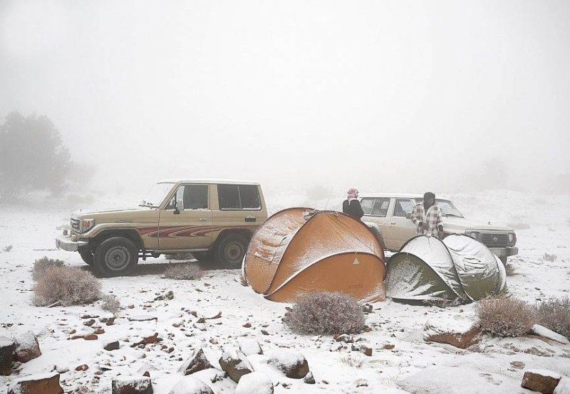 وللمرة الثالثة خلال هذا الموسم، شهدت مرتفعات جبل اللوز بمنطقة تبوك تساقط الثلوج، فيما تحولت المرتفعات بمحافظة الطائف وتحديداً المناطق السياحية «الشفاء» إلى لوحة فنية لاكتسائها بالضباب.
