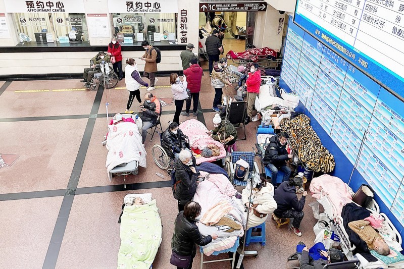 مرضى يرقدون على نقالات في بهو استقبال الطوارئ في أحد مستشفيات شنغهاي. (وكالات)