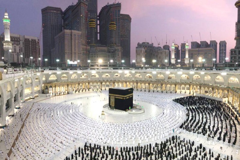 معتمرون ومصلون يؤدون الصلاة في صحن المطاف بالحرم المكي. (واس)