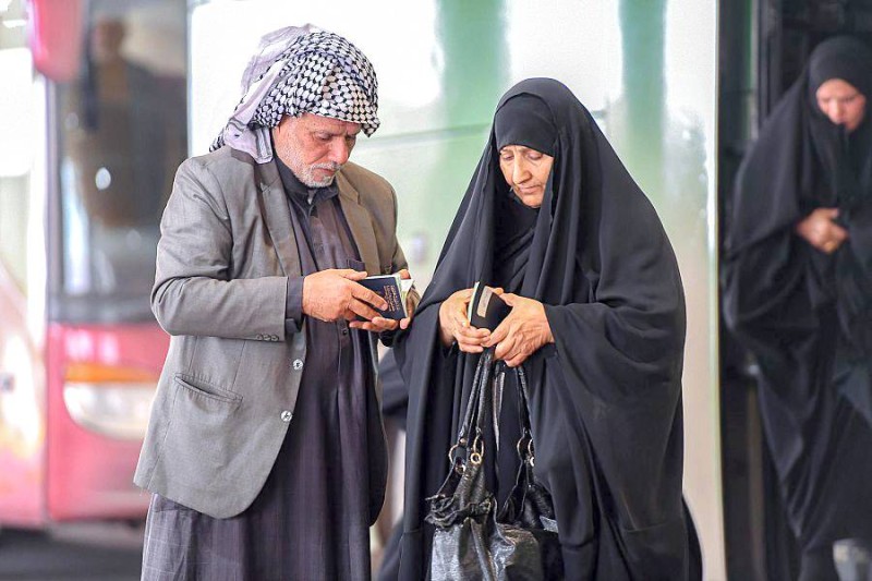 معتمرون عراقيون بعد انتهاء إجراء دخولهم المملكة. (واس)