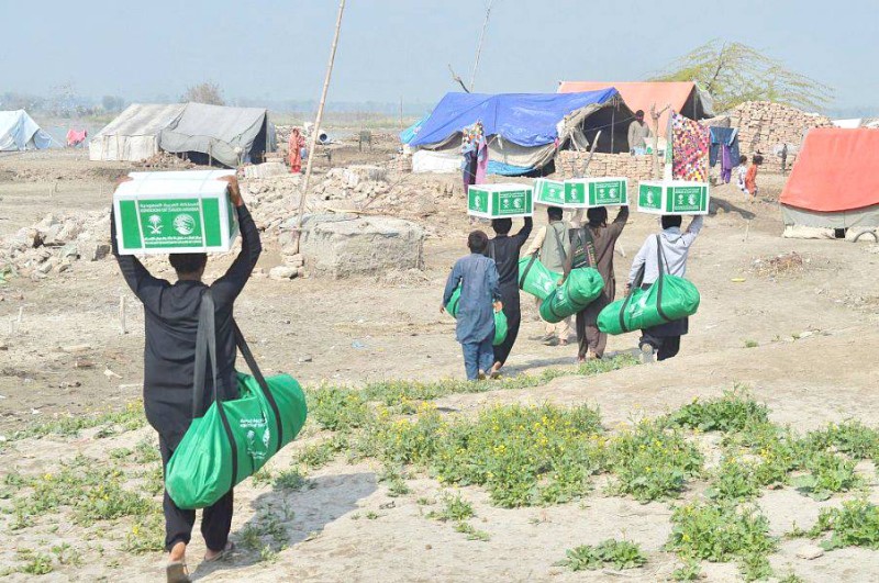 مواطنون باكستانيون يحملون المساعدات الإنسانية والإغاثية السعودية. (واس)