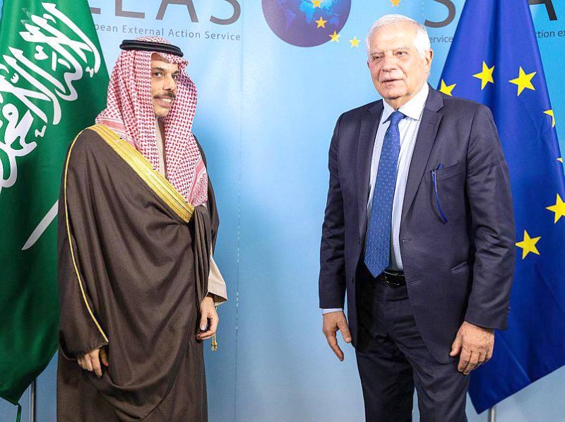 الأمير فيصل بن فرحان وجوزيب بوريل خلال لقائهما أمس. (واس)