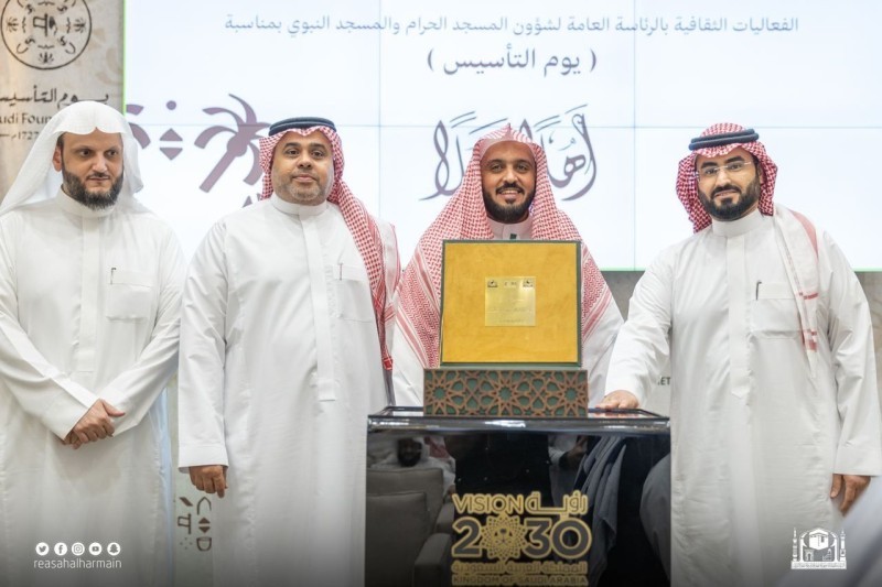 احتفت الرئاسة العامة لشؤون المسجد الحرام والمسجد النبوي، اليوم (الأحد)، بذكرى يوم التأسيس، برعاية من الرئيس العام الشيخ الدكتور عبدالرحمن بن عبدالعزيز السديس وحضور مساعدي ووكلاء الرئيس العام وعدد من القيادات والمنسوبين بالرئاسة.