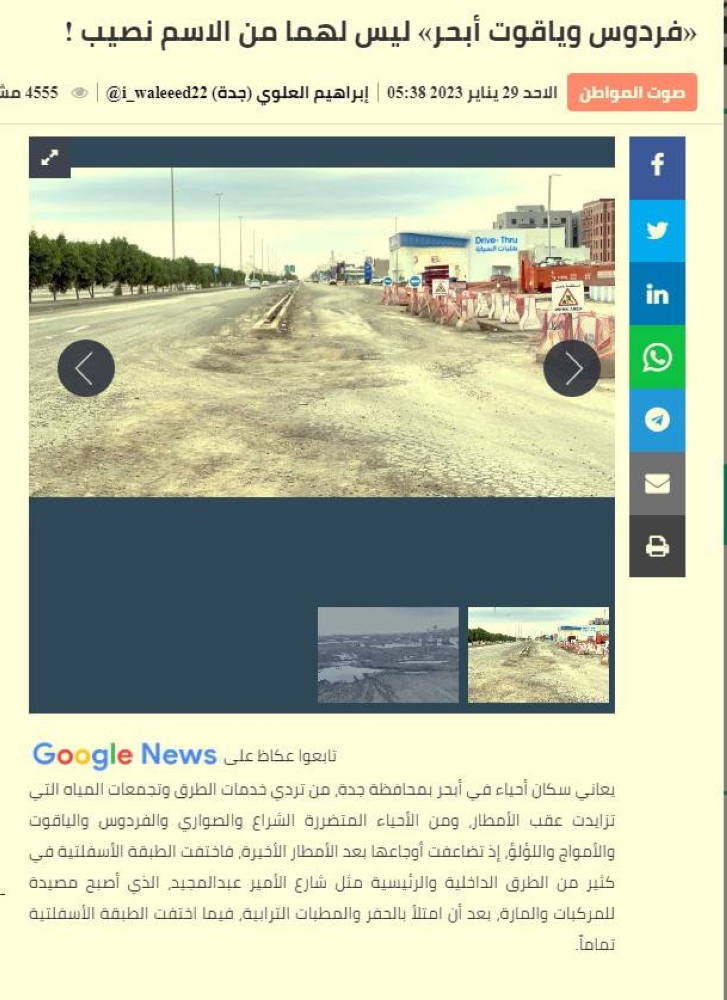 أوضحت أمانة جدة، أن حيي الفردوس والياقوت بأبحر، لا تغطيهما شبكة صرف صحي؛ ما أدى إلى ارتفاع منسوب المياه السطحية، ونتج عن ذلك تهالك طبقات الرصف وحدوث تشققات وهبوطات في الأسفلت.