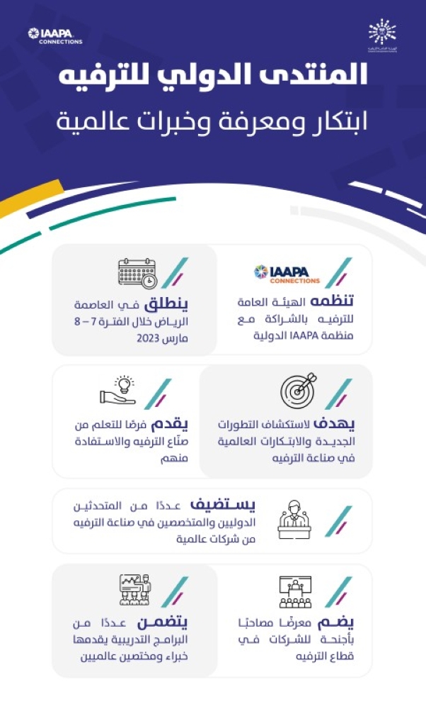 تنتظر العاصمة الرياض، انطلاق المنتدى الدولي للترفيه، الذي تنظمه الهيئة العامة للترفيه بالشراكة مع المنظمة الدولية للوجهات والمدن الترفيهية IAAPA، والتي تضم أكثر من 6 آلاف عضو في صناعة الترفيه في أكثر من 100 دولة حول العالم، وذلك خلال الفترة 7 – 8 مارس الجاري، في حدث كبير يعد الأبرز من نوعه على مستوى الشرق الأوسط.