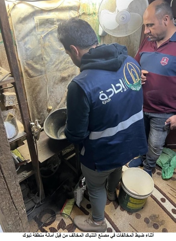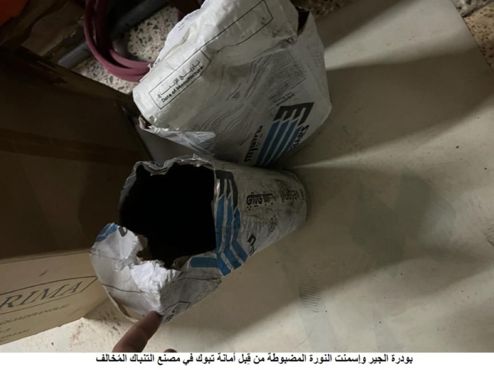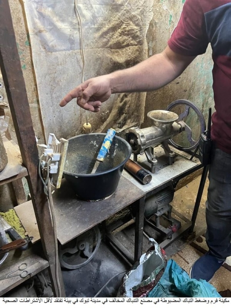 وأوضح لـ«عكاظ» مدير إدارة العلاقات العامة والإعلام المتحدث باسم أمانة منطقة تبوك يحيى الجراح أن المنزل يديره 6 عمالة آسيويين لتصنيع مادة التنباك في بيئة تفتقد لأقل الاشتراطات الصحية، مبينا أنه تمت مصادرة ما يزيد على ١٣٠ كيلوغراما من مادة التنباك وبودرة الجير وإسمنت النورة، ومكينة فرم وضغط التنباك.