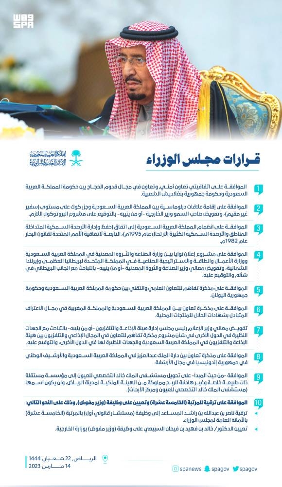الموافقة على إقامة علاقات دبلوماسية بين المملكة العربية السعودية وجزر كوك على مستوى (سفير غير مقيم)، وتفويض وزير الخارجية -أو من ينيبه- بالتوقيع على مشروع البروتوكول اللازم.