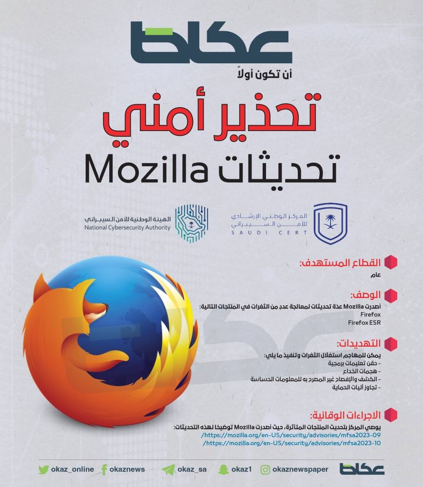 أطلق المركز الوطني الإرشادي للأمن السيبراني السعودي تحذيراً أمنياً عالي الخطورة بخصوص تحديثٍ أمني في منتجات موزيلا.