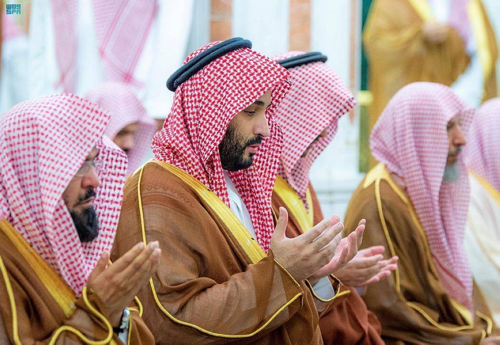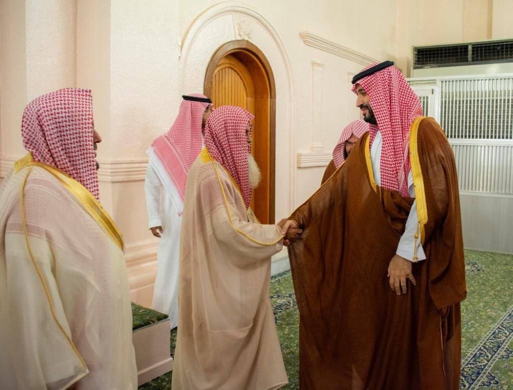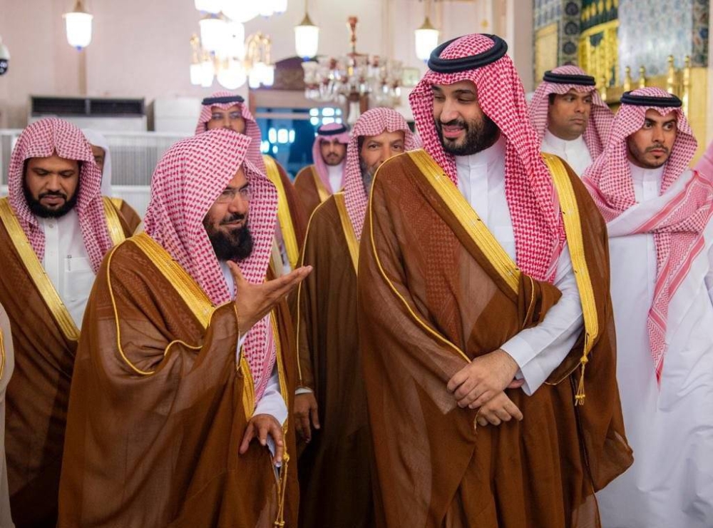 وكان في استقبال ولي العهد لدى وصوله الحرم النبوي، الرئيس العام لشؤون المسجد الحرام والمسجد النبوي الشيخ الدكتور عبدالرحمن بن عبدالعزيز السديس، وأئمة وخطباء ومساعدو الرئيس لشؤون المسجد النبوي.