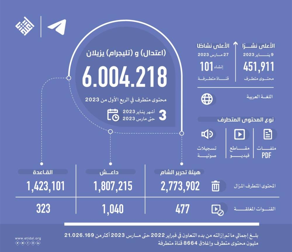 أزال المركز العالمي لمكافحة الفكر المتطرف (اعتدال)، ومنصة (تليجرام)، خلال الفترة من (يناير – مارس) 2023، ( 6,004,218) محتوى متطرفا، وإغلاق (1840) قناة استُخدمت في بث وترويج الأفكار المتطرفة، تعود لثلاثة تنظيمات إرهابية (داعش، القاعدة، هيئة تحرير الشام).
