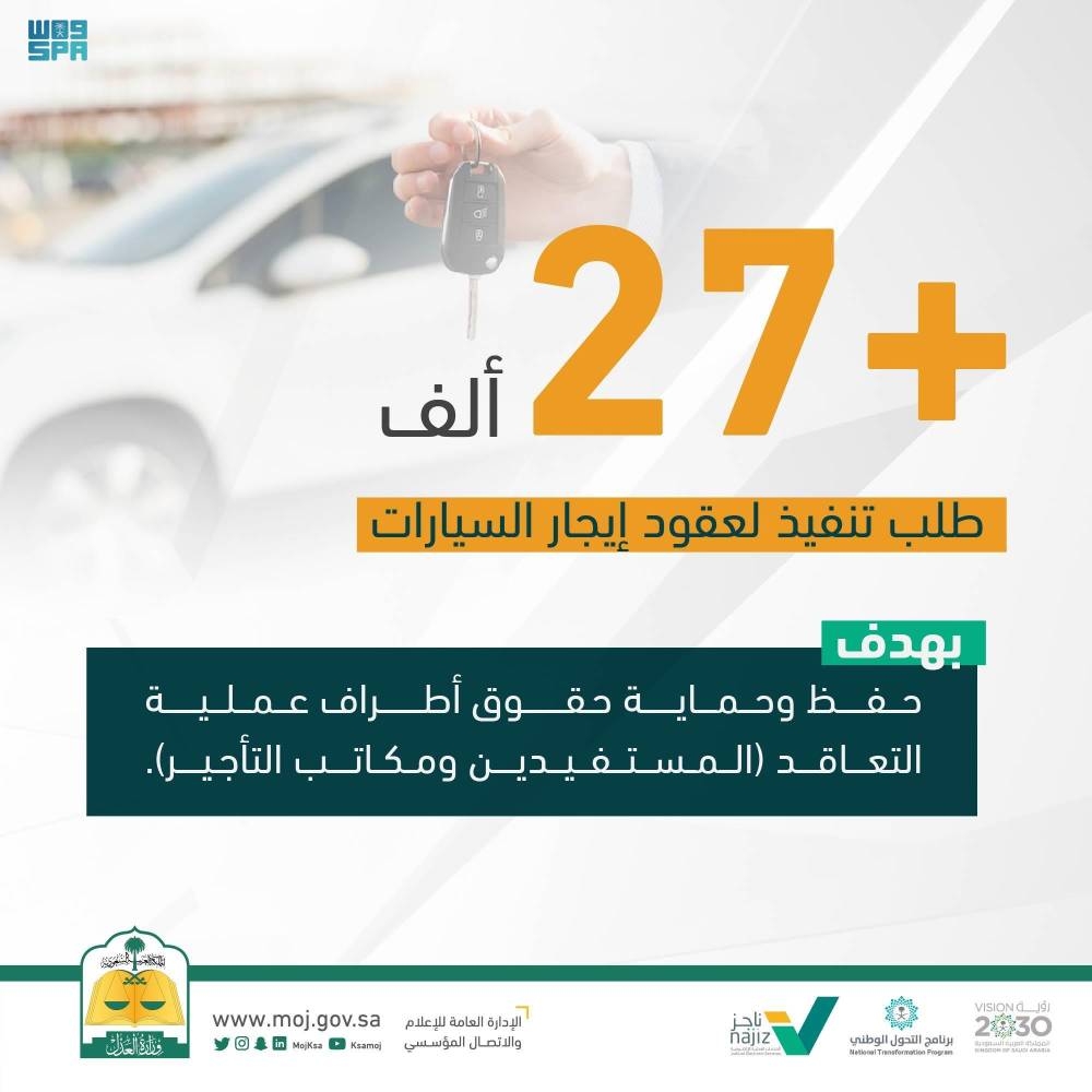 استقبلت وزارة العدل عبر محاكم التنفيذ في المملكة أكثر من 27 ألف طلب تنفيذ لعقود إيجار سيارات منذ بدء استقبال المحاكم لعقود تأجير السيارات كسندات تنفيذ، حيث تسري عليها أحكام العقود الموثقة من حيث الإثبات والتنفيذ.