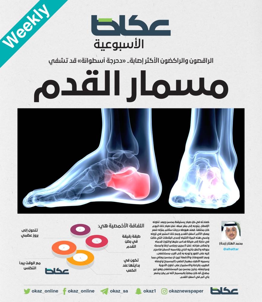 استشاري جراحة العظام الدكتور عبدالعزيز باصقر، يرى أن إصابة مسمار كعب القدم، قد تتطور إلى التهاب يسمى باللفافة الأخمصية، ويكوّن الجسم نتوءاً عظمياً بسبب رواسب الكالسيوم على عظم الكعب، وهذه اللفافة هي أحد أكثر مسببات آلام الكعب شيوعاً في المجتمع؛ وهي عبارة عن التهاب في الأنسجة التي تمتد عبر الجزء السفلي من القدم وتربط بين عظم العقب وأصابع القدم، ويكون الألم شديداً في الخطوات الأولى صباحاً عند النهوض من السرير ويقل بالتدريج مع الحركة، ويعود بعد فترات طويلة من الوقوف أو عند الوقوف بعد الجلوس لفترة طويلة، وعادةً يكون تشخيص المشكلة إكلينيكياً ولا يستدعي عمل أشعة.