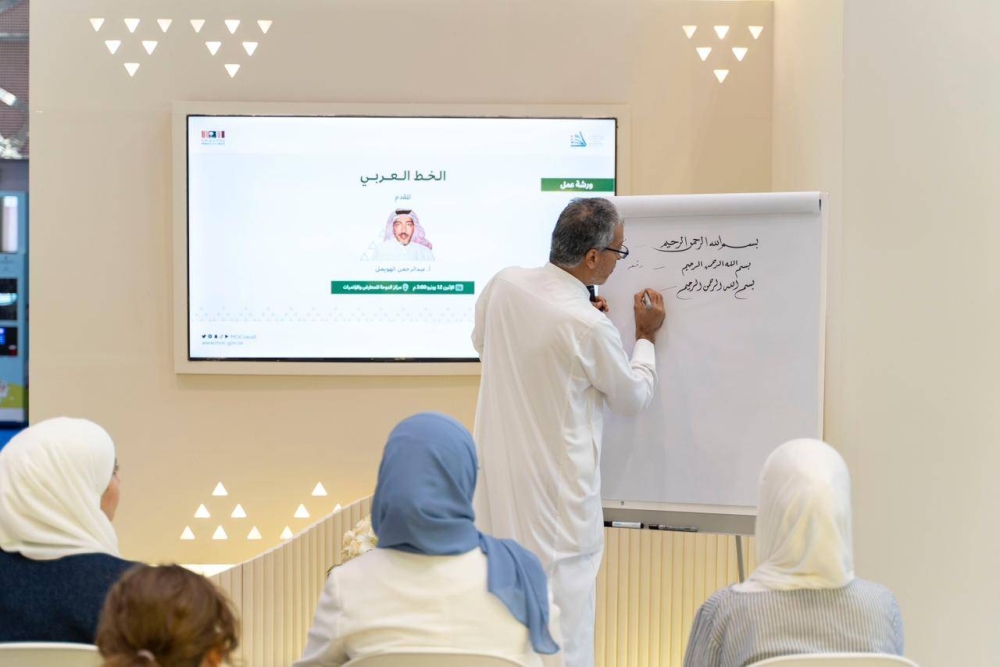 وحظيت ورش تعليم الخط العربي التي يقدمها الخطاطون عبدالرحمن الهويمل وعبدالله الناصر وفاطمة الصرامي بإقبال جماهيري لافت من زوار المعرض الذين تعلموا أسس الخط، وتدربوا على الكتابة برفقة الخطاطين.