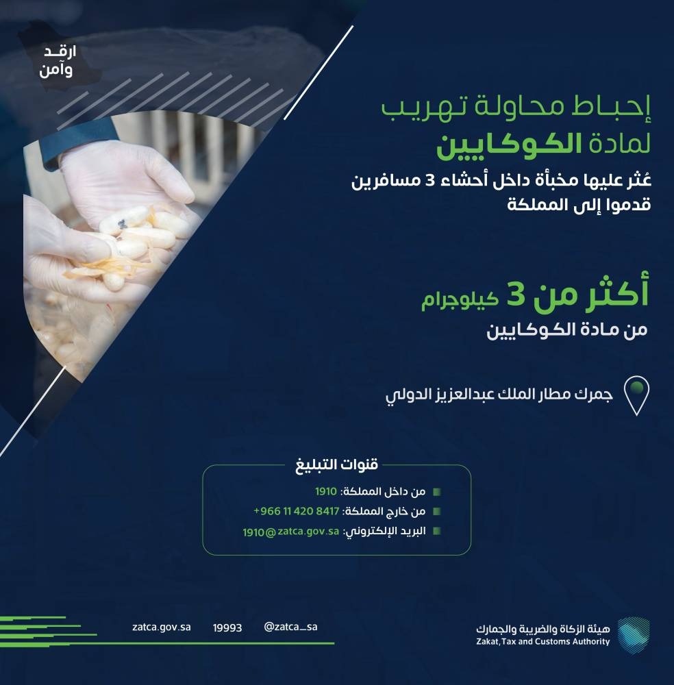تمكنت هيئة الزكاة والضريبة والجمارك في مطار الملك عبدالعزيز الدولي بجدة من إحباط محاولة تهريب أكثر من 3 كيلوغرامات من مادة «الكوكايين» المخدرة.