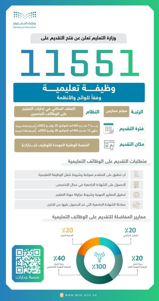 أعلنت وزارة التعليم فتح التقديم على 11,551 وظيفة تعليمية شاغرة للعام الدراسي 1445، في عدد من التخصصات في إدارات التعليم للجنسين بنظام التعاقد، من خلال المنصة الوطنية الموحدة للتوظيف «جدارات».