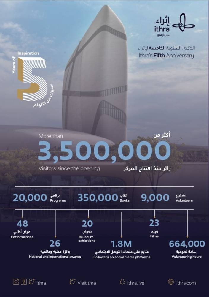 وبمرور خمس سنوات على إنشاء هذه الحاضنة المعرفيّة الإبداعية التي جاءت هدية من أرامكو السعودية للمجتمع، وتهدف إلى الاستثمار في الإمكانات البشرية من ناحية والإسهام بإثراء المشهد الإبداعي والثقافي في المملكة من ناحية أخرى؛ أصبح مركز «إثراء» بوابة للمملكة تربطها بالعالم، ومنارة تولد منها الأفكار ويُحتفى فيها بالإبداع، حيث حقق المركز خلال رحلته القصيرة العديد من النجاحات بفضل الباقة الثرية من البرامج والفعاليات والمبادرات على المستوى المحلي والإقليمي والدولي، ليجسد التزام المركز بإثراء حياة الزوار وتحفيز المعرفة والإبداع تحقيقاً لرؤية المملكة 2030.