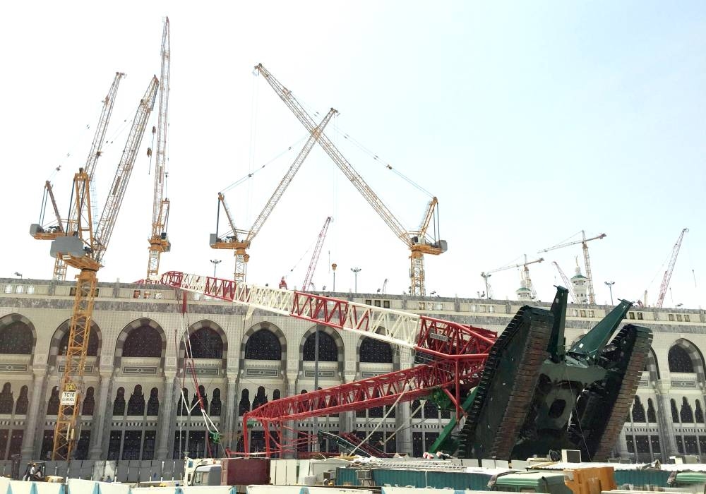 يشار إلى أن حادثة سقوط الرافعة المجنزرة التابعة لمجموعة بن لادن السعودية، وقع عند الساعة 18:05 مساء الجمعة 27/11/1436هـ، بالساحة الشرقية للمسجد الحرام، بسبب تعرضها لرياح هابطة بسرعة قدرت بـ 80 كم/س، نتج عنها وفاة 110 أشخاص، وإصابة 209 بالإصابات الموصوفة بالتقارير الطبية، وتلفيات مادية بمبنى الحرم المكي، وقررت النيابة العامة توجيه التهم لمجموعة بن لادن بالإهمال والتقصير وعدم اتخاذ مسؤولي السلامة ومديري المشروع ما يجب عليهم من الحيطة والحذر في متابعة الأحوال الجوية وفق مراحل التنبيهات الصادرة من الرئاسة العامة للأرصاد وحماية البيئة، والتفاعل معها بإجراءات احتياطية تكفل سلامة الموقع ومرتاديه أو تقليل المخاطر والآثار الناجمة عن الحادثة أثناء مباشرتها للأعمال الإنشائية الموكلة لها في توسعة المطاف بالحرم المكي الشريف.