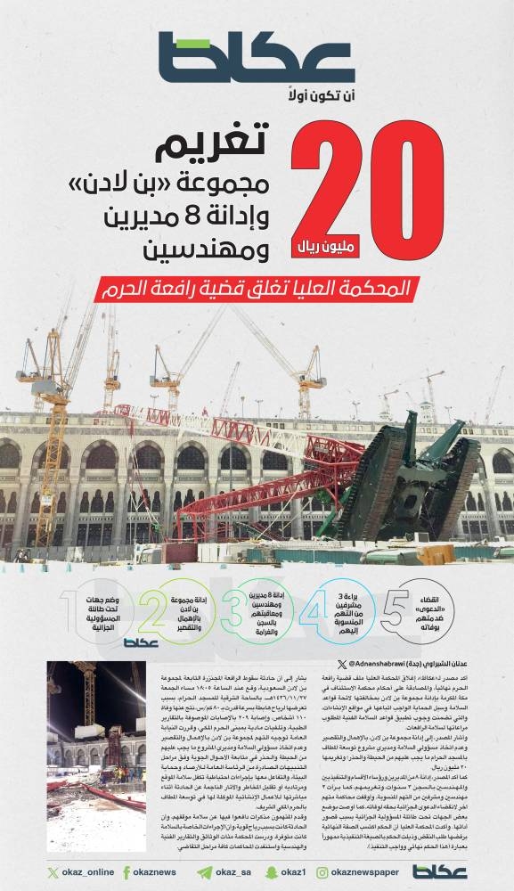 وأشار المصدر، إلى إدانة مجموعة بن لادن، بالإهمال والتقصير وعدم اتخاذ مسؤولي السلامة ومديري مشروع توسعة المطاف بالمسجد الحرام ما يجب عليهم من الحيطة والحذر؛ وتغريمها 20 مليون ريال.