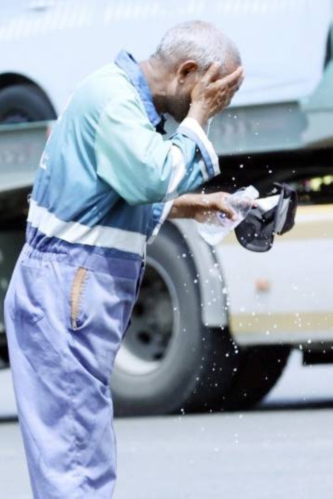 عامل يرش الماء على وجهه من شدة الحر. (تصوير: مديني عسيري)