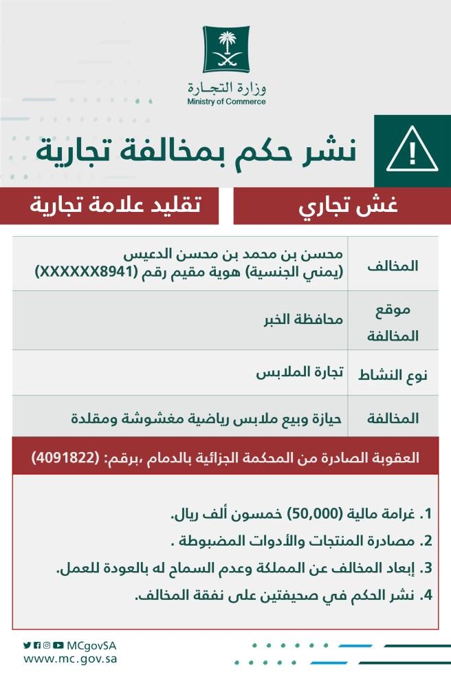 شهرت وزارة التجارة بمقيم من الجنسية اليمنية بعد صدور حكم قضائي نهائي يدينه بمخالفة نظامي مكافحة الغش التجاري والعلامات التجارية إثر ثبوت تورطه في حيازة وبيع ملابس رياضية مغشوشة ومقلدة لعلامات تجارية معروفة.