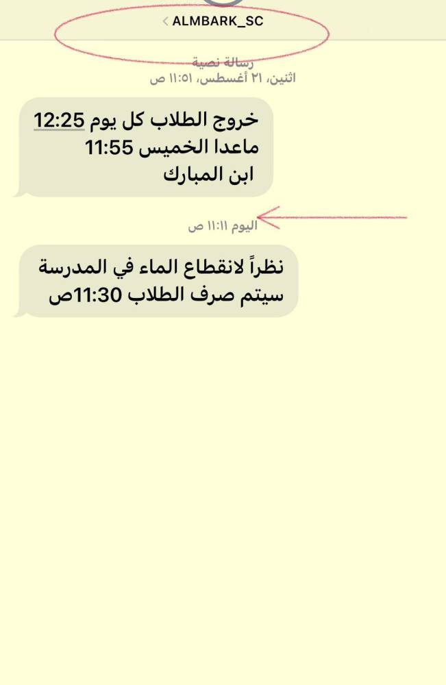 وفي أثناء نفي تعليم الطائف وردت أمس (الأربعاء) رسائل من إدارة المدرسة لأولياء الأمور وتنشرها «عكاظ» «نظراً لانقطاع الماء في المدرسة سيتم صرف الطلاب 11:30ص».