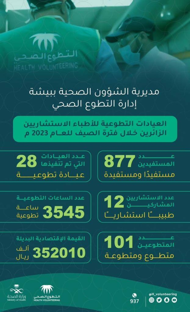 نفّذت صحة بيشة ممثلةً بإدارة التطوع الصحي خلال صيف هذا العام 2023، مبادرة «العيادات التطوعية للأطباء الاستشاريين الزائرين» في 6 من مستشفياتها، حيث بلغ عدد المستفيدين 877 مستفيدًا ومستفيدة.