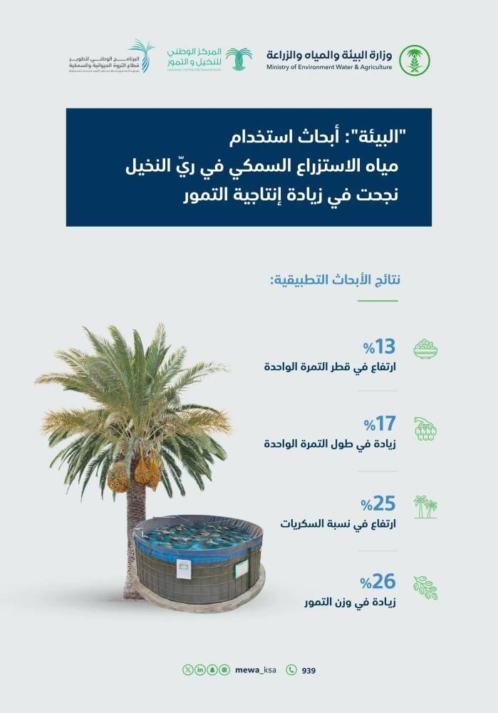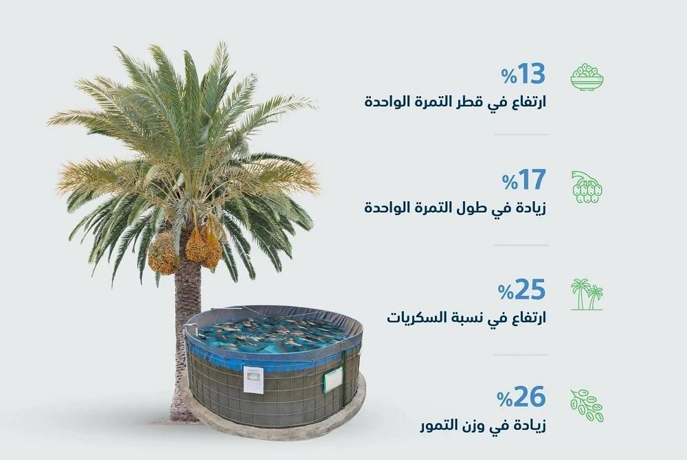 أكدت وزارة البيئة والمياه والزراعة، أن النتائج البحثية النوعية لمشاريع الاستزراع السمكي بالنظام المغلق، أظهرت نجاحها في زيادة كفاءة وإنتاجية أشجار النخيل في السعودية، وذلك باستخدام مياه صرف أحواض مزارع الأسماك كمياه الريّ؛ التي تُقلل من الحاجة لإضافة بعض العناصر الغذائية التي تحتاجها أشجار النخيل كالأسمدة، لاحتواء مياه مصارف الأسماك على تراكيز مختلفة من هذه العناصر المهمة.
